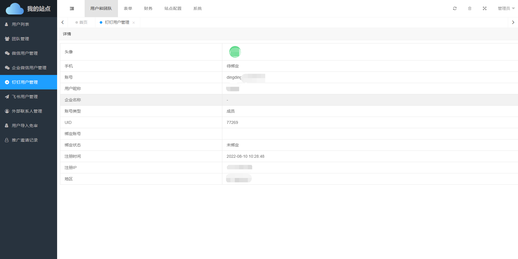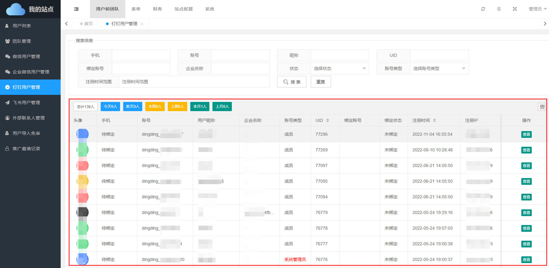 • 绑定账号:钉钉账号绑定的普通账号,只有系统管理员账号有绑定账号