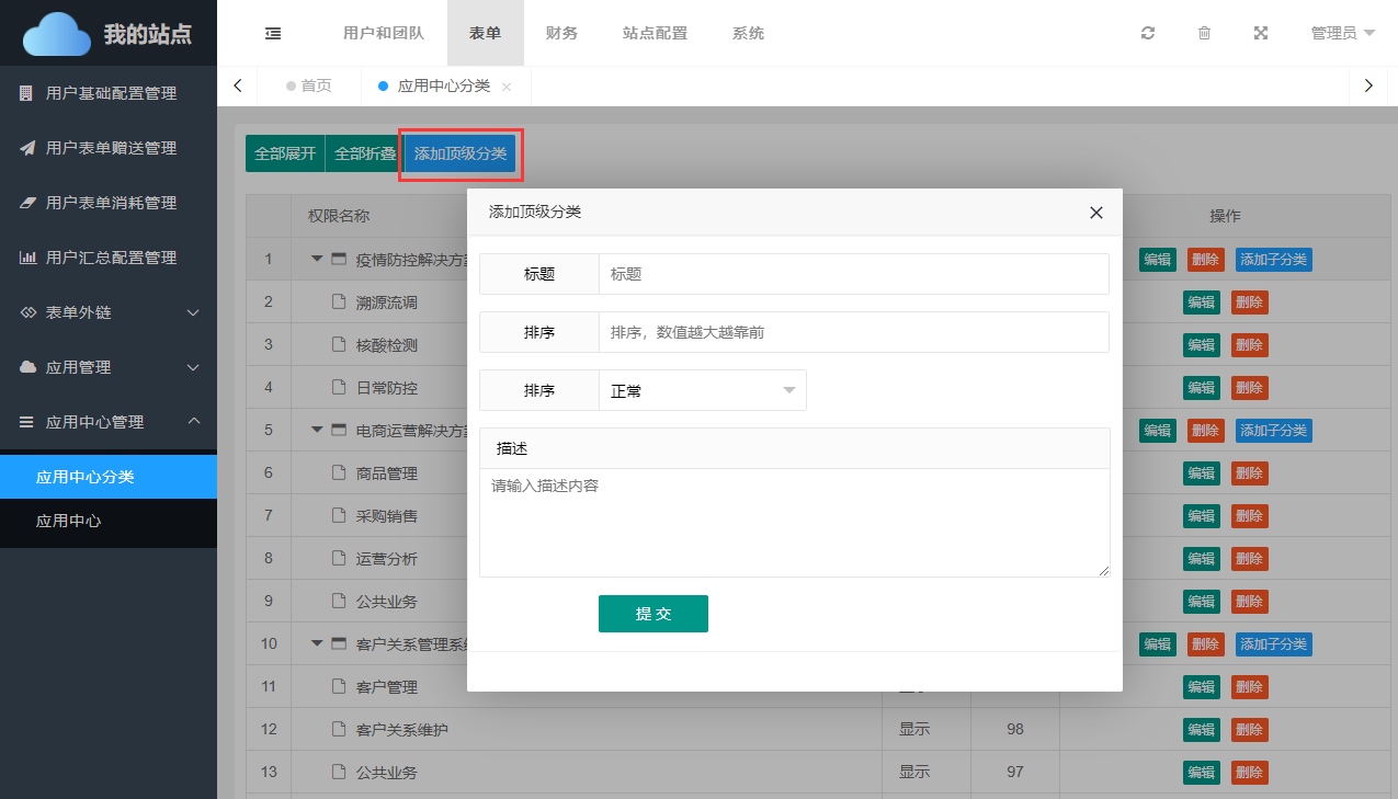 被添加的顶级分类,将作为应用中心的主要分类,添加分类时,可指定标题、排序[优先级]、排序[方式]以及详细描述信息。