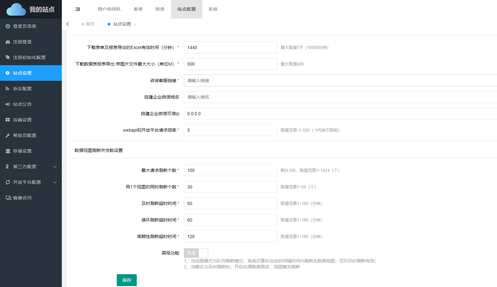 在其他设置中主要是对下载表单及报表导出的Excel有效时间、下载数据表报表导出带图片文件最大大小、咨询客服链接、自建企业微信域名、自建企业微信可信ip、webapi和开放平台请求频率、数据视图刷新并发数、数据视图刷新超时时间等功能进行设置。