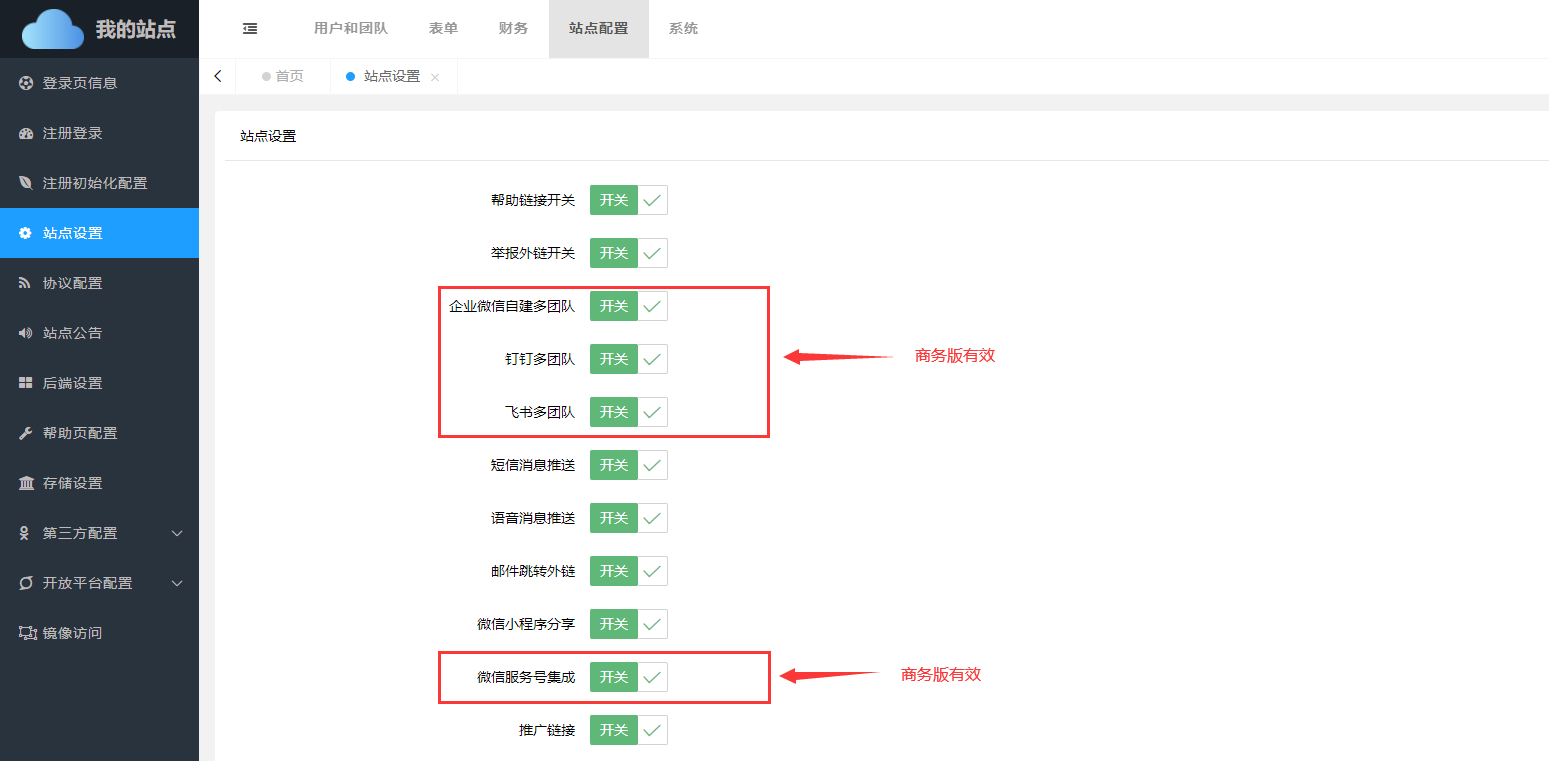 站点设置中可以对帮助链接开关、举报外链开关、钉钉多团队、飞书多团队、短信消息推送、语音消息推送、邮件跳转外链等功能进行设置。