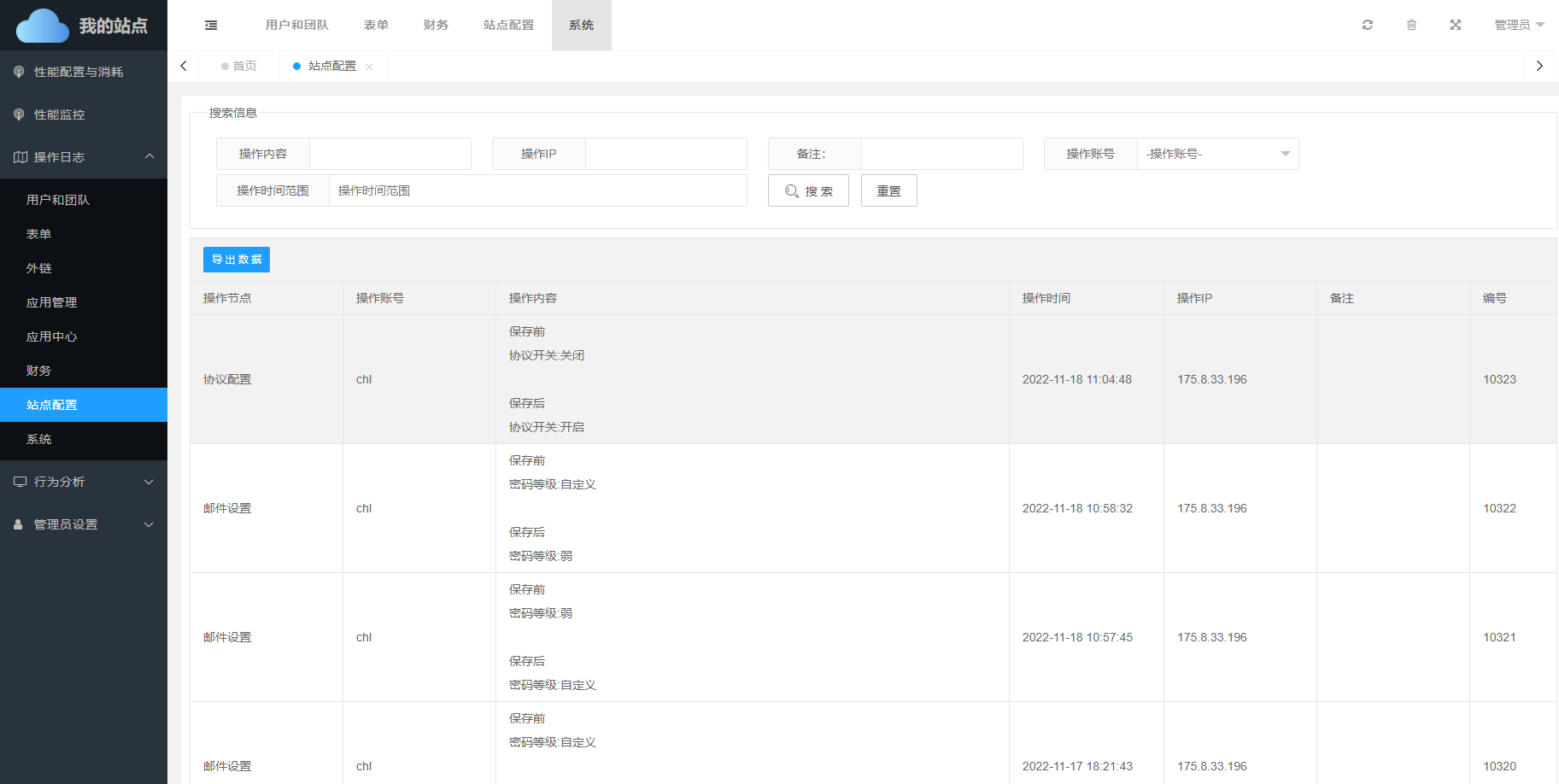 在站点配置操作日志中,会详细的记录每一项操作内容。