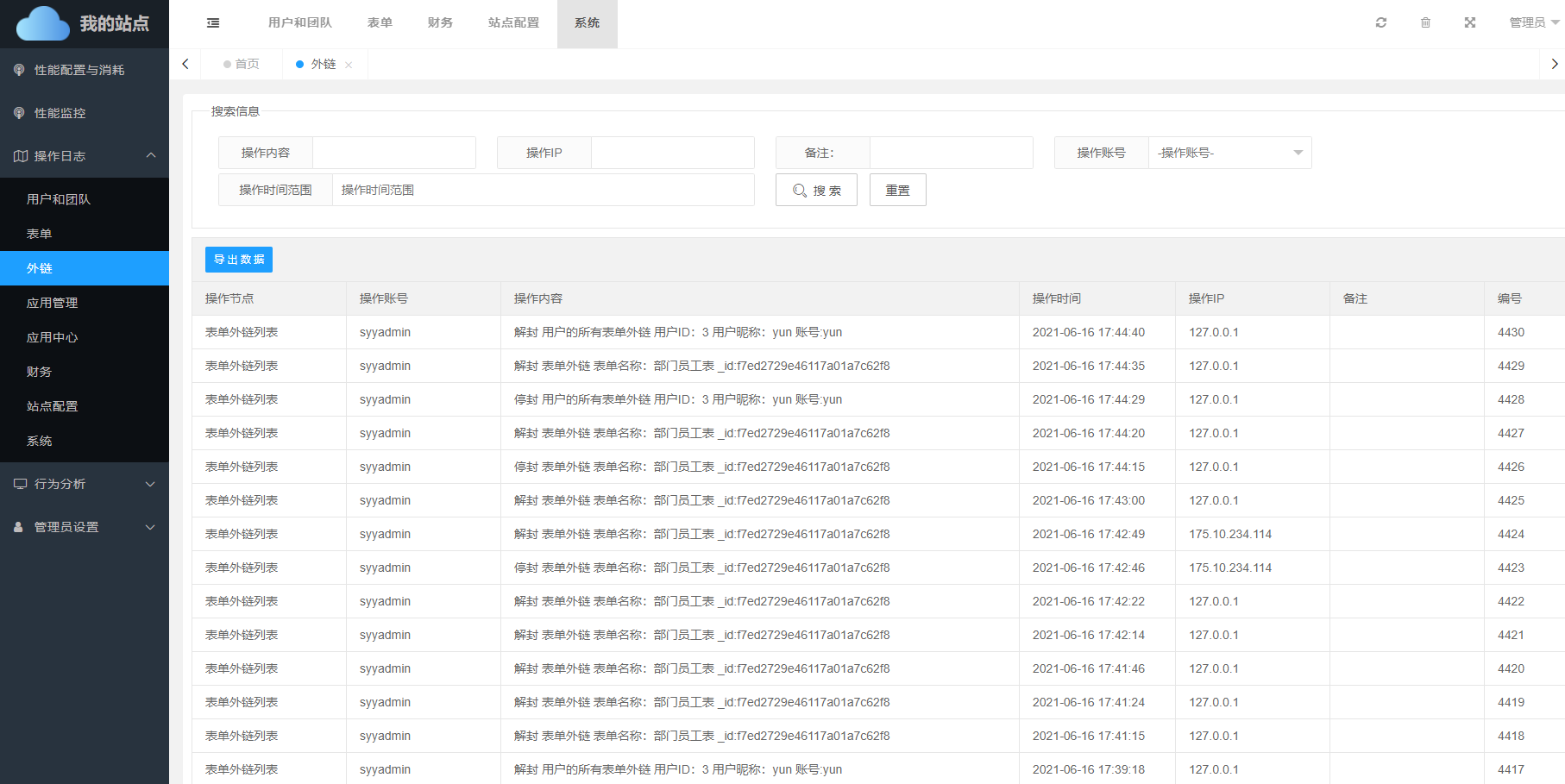 管理员对用户开放的外链可以进行对应的管理,其操作记录会记录在外链日志当中。