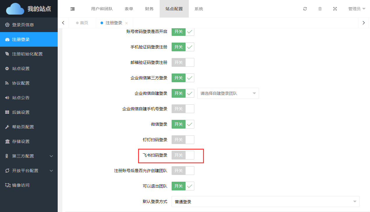 如需对接飞书办公,首先需要在后台【站点配置】->【注册登录】选项中,开启飞书扫码登录开关,否则无法启用扫码功能。