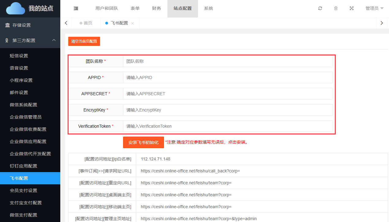 进入后台管理页面站点配置->第三方配置->飞书应用配置页面,将刚才所记录的内容,填写到对应的输入框内。