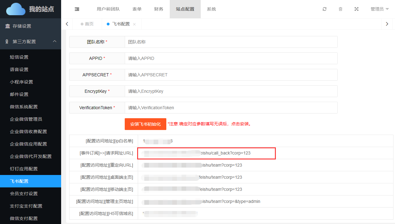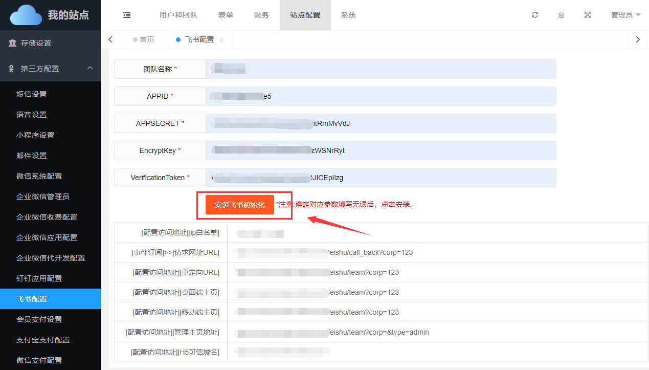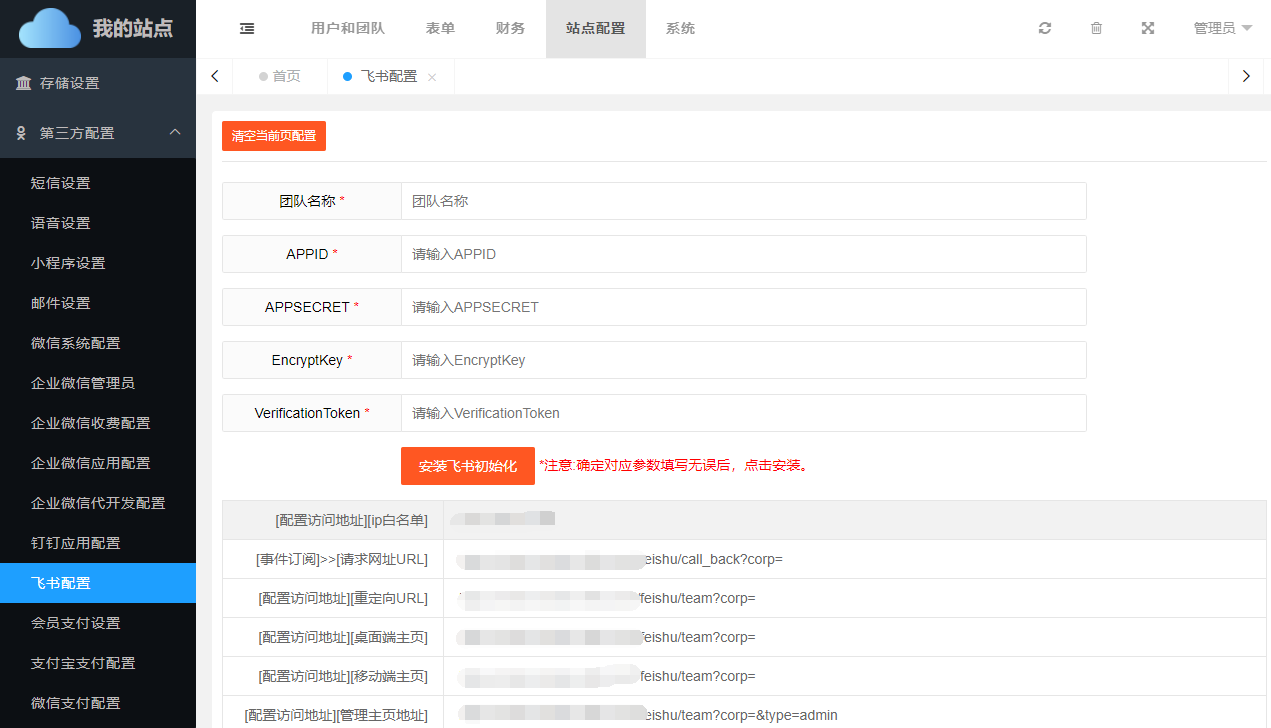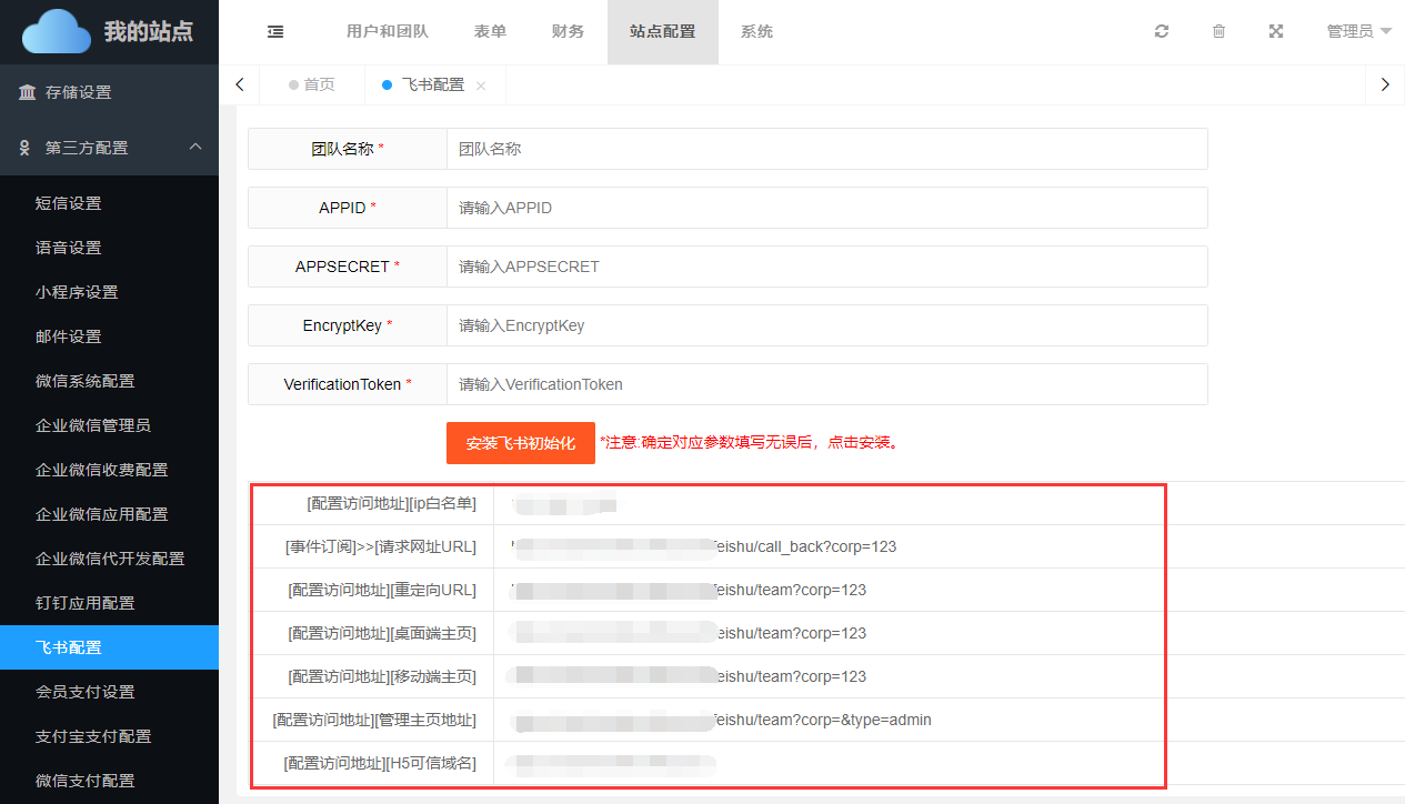 除此之外,还需要在【站点配置】->【第三方配置】->【飞书应用配置】中正确填写绑定参数。