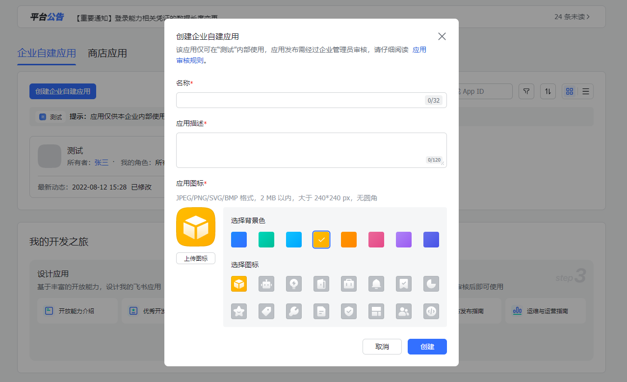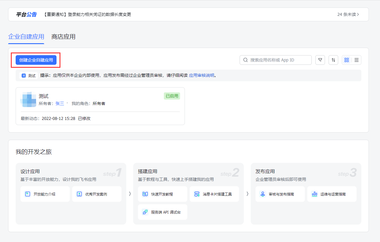平台的飞书应用绑定采用了飞书【企业自建应用】的模式对接,使用该模式对接,可以获取更多的能力。