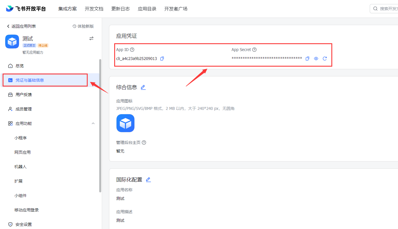 进入凭证与基础信息页面,在此页面,将App ID、App Secret这两个参数保存下来.