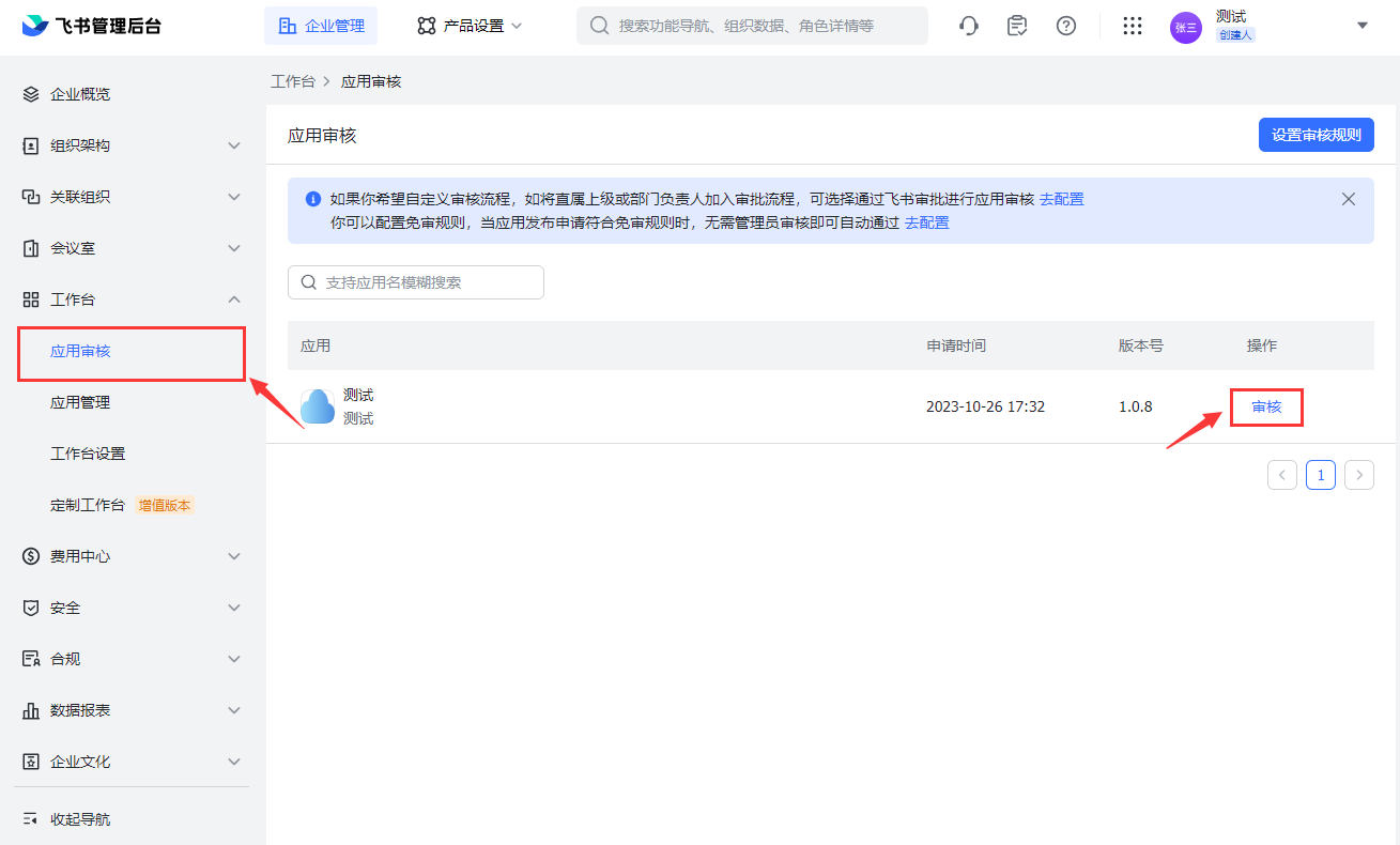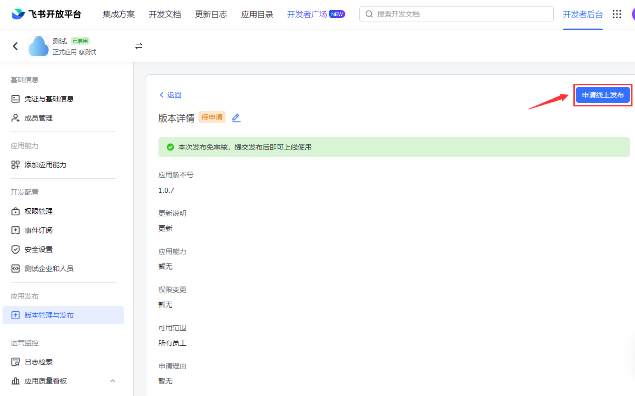 登录飞书管理后台并通过审核,如发布时提示无需审核可跳过这步。