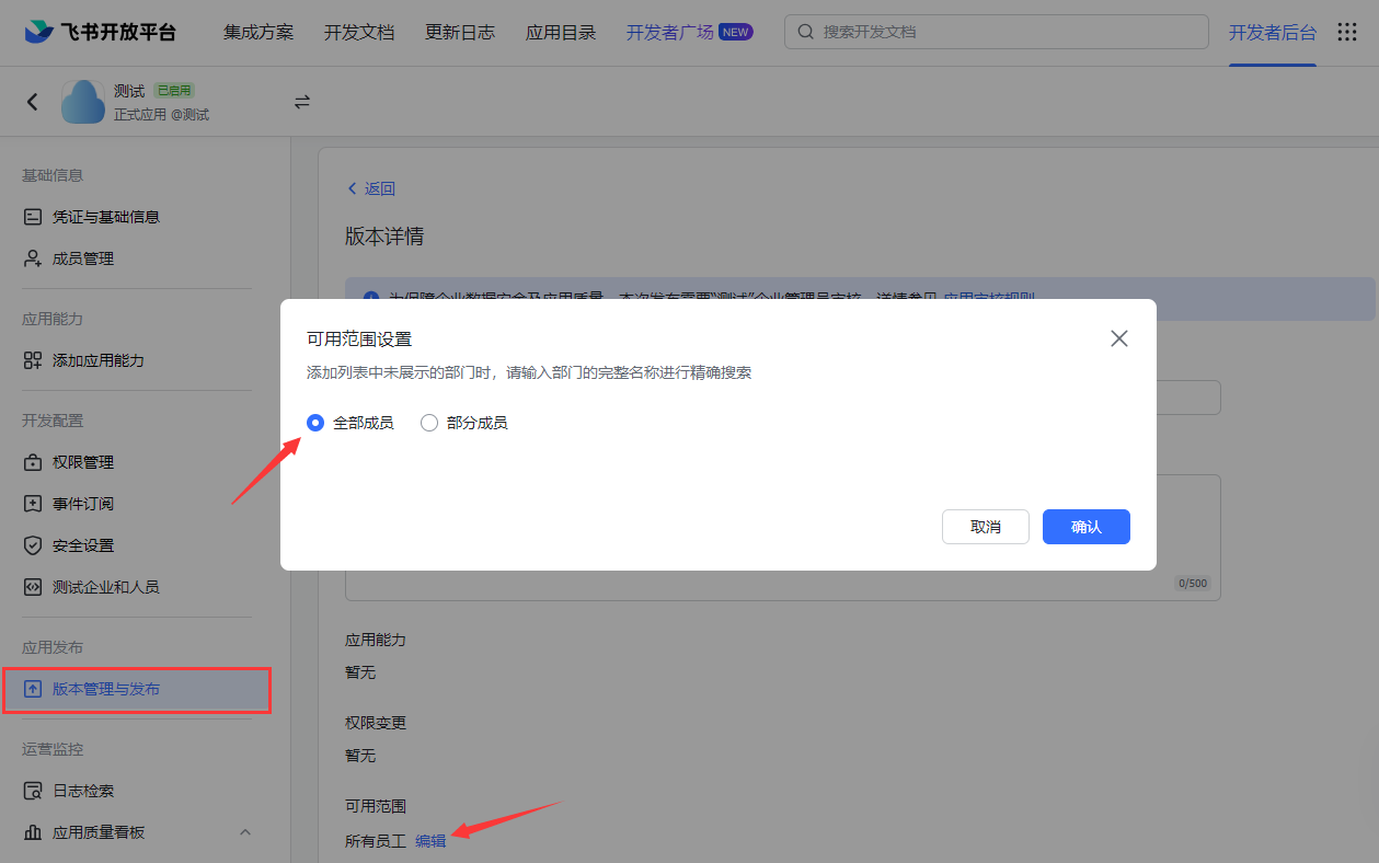 创建版本之后,并设置其可用性为:全部成员