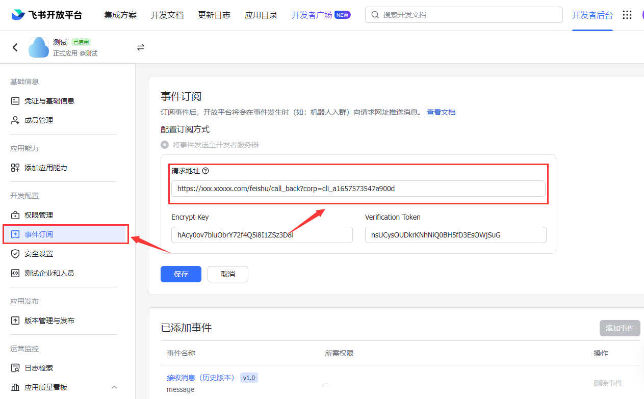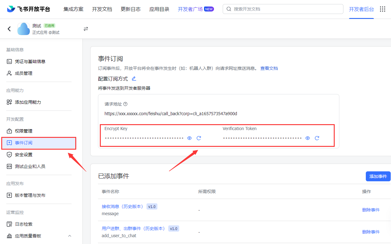 进入事件订阅页面,将Encrypt Key和Verification Token这两个参数保存下来。