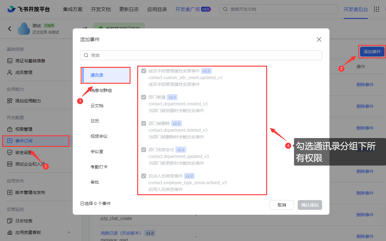 在事件订阅页面添加事件,并在弹出的窗口内选择通讯录分页,勾选所有选项。