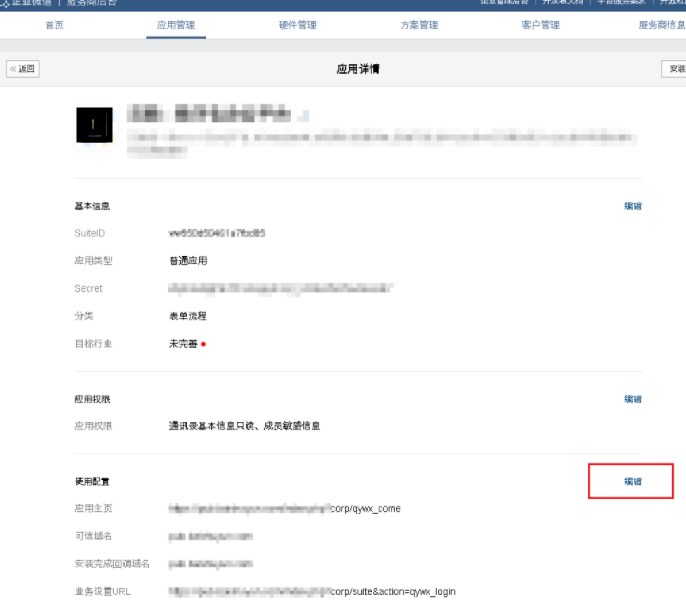 1、打开新创建的应用,找到使用配置,点击后面的编辑