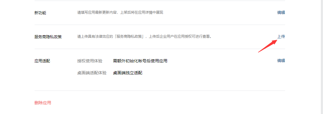 【应用开发】->【网页应用】,进入新添加的应用,找到服务商隐私政策,点击上传