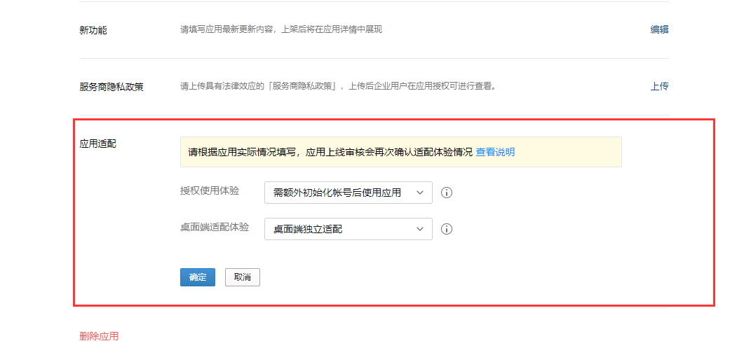 【应用开发】->【网页应用】,进入新添加的应用,找到应用适配,进行设置