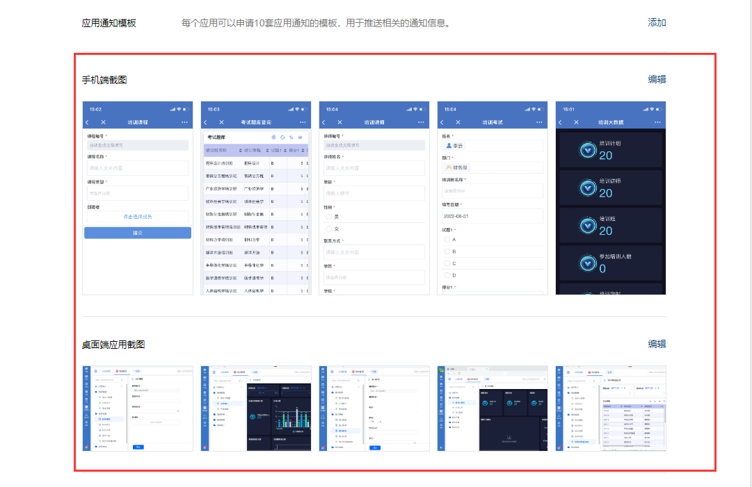 手机端需上传企业微信内打开的应用界面截图。建议上传5张能体现完整应用功能的截图