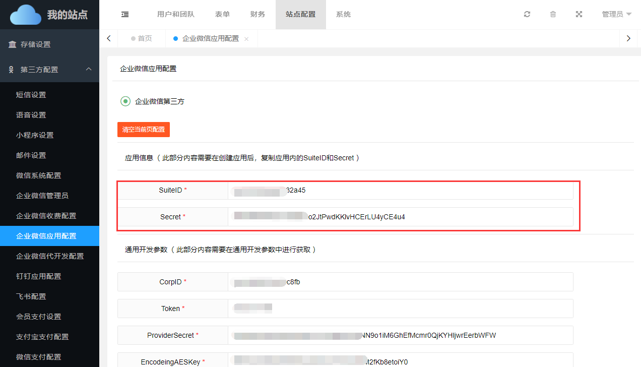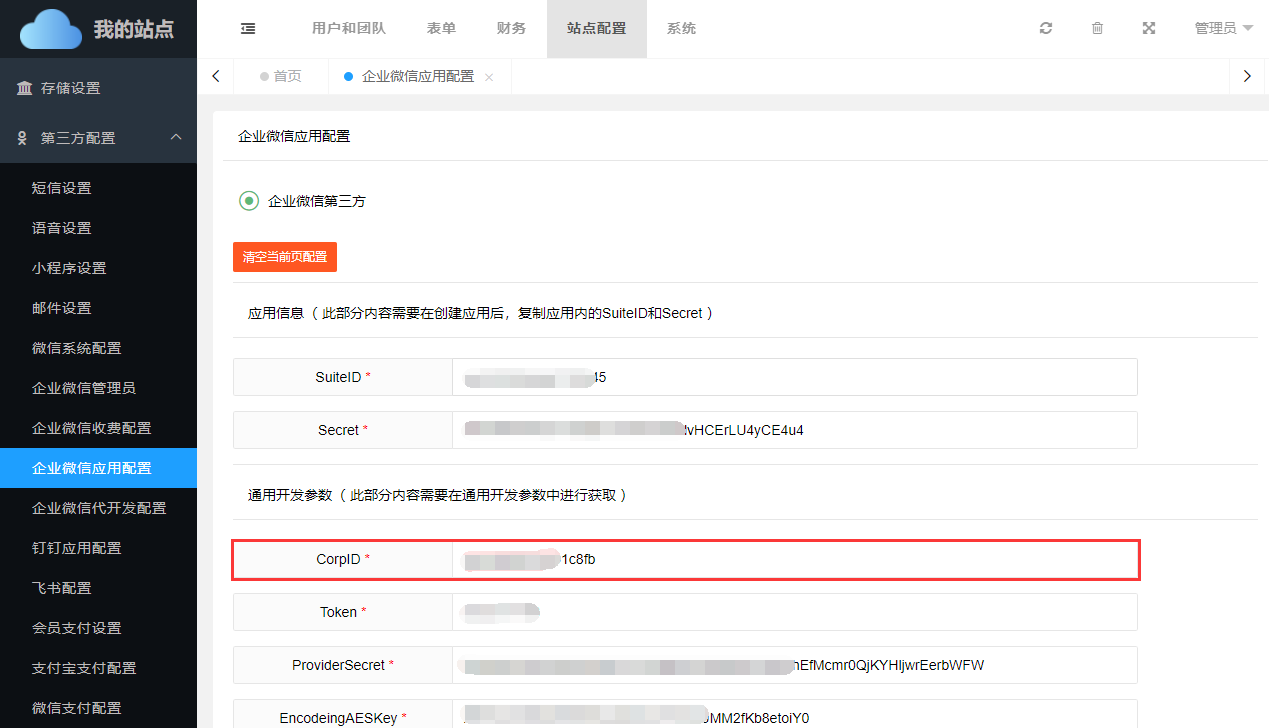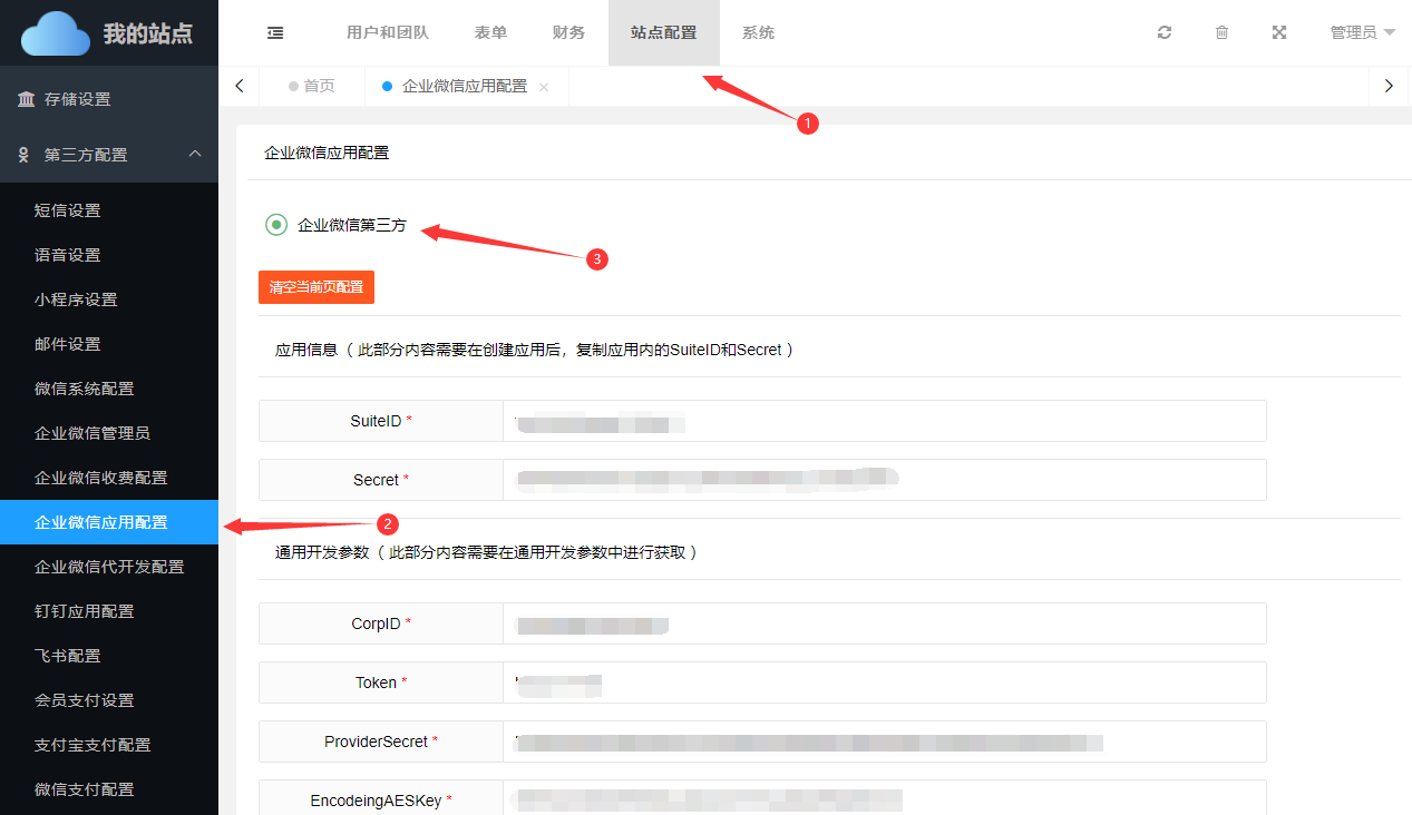 依次进入【第三方管理】->【企业微信应用配置】->切换到【企业微信第三方配置】
