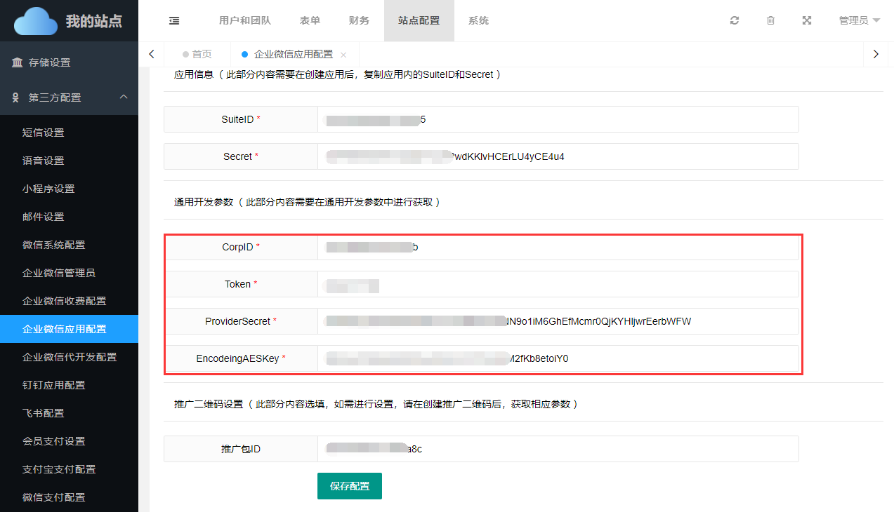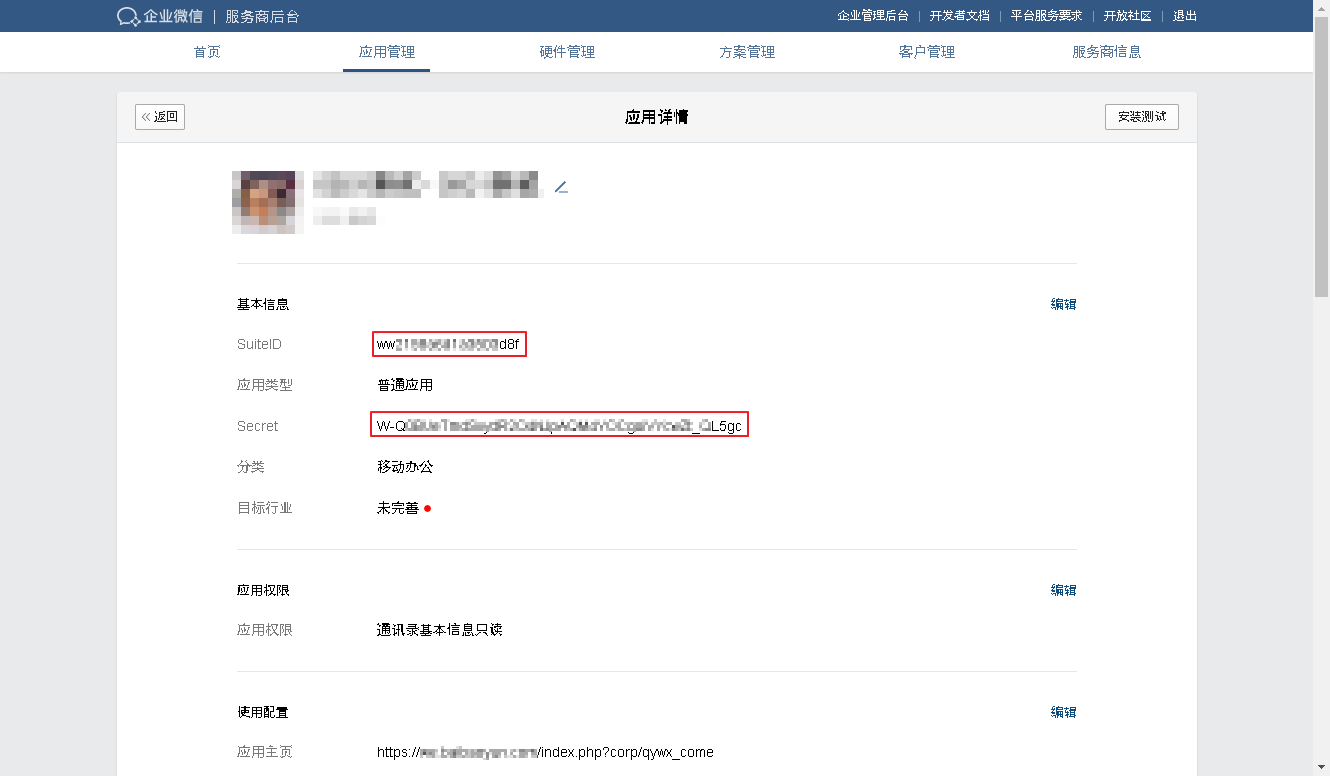 打开新创建的应用,找到SuiteID和Secret将这两项粘贴到对应的SUITE_ID和SUITE_SECRET位置。