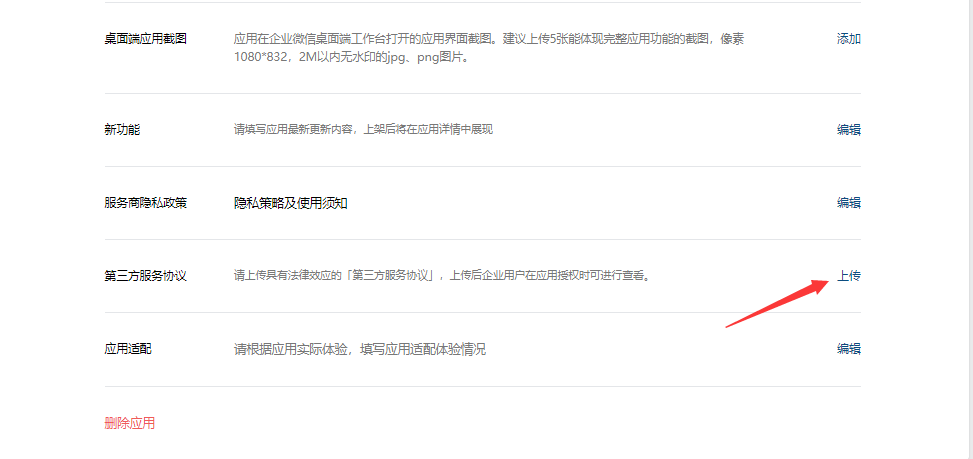 【应用开发】->【网页应用】,进入新添加的应用,找到第三方服务协议,点击上传(协议可下载企业微信提供的模板进行修改)