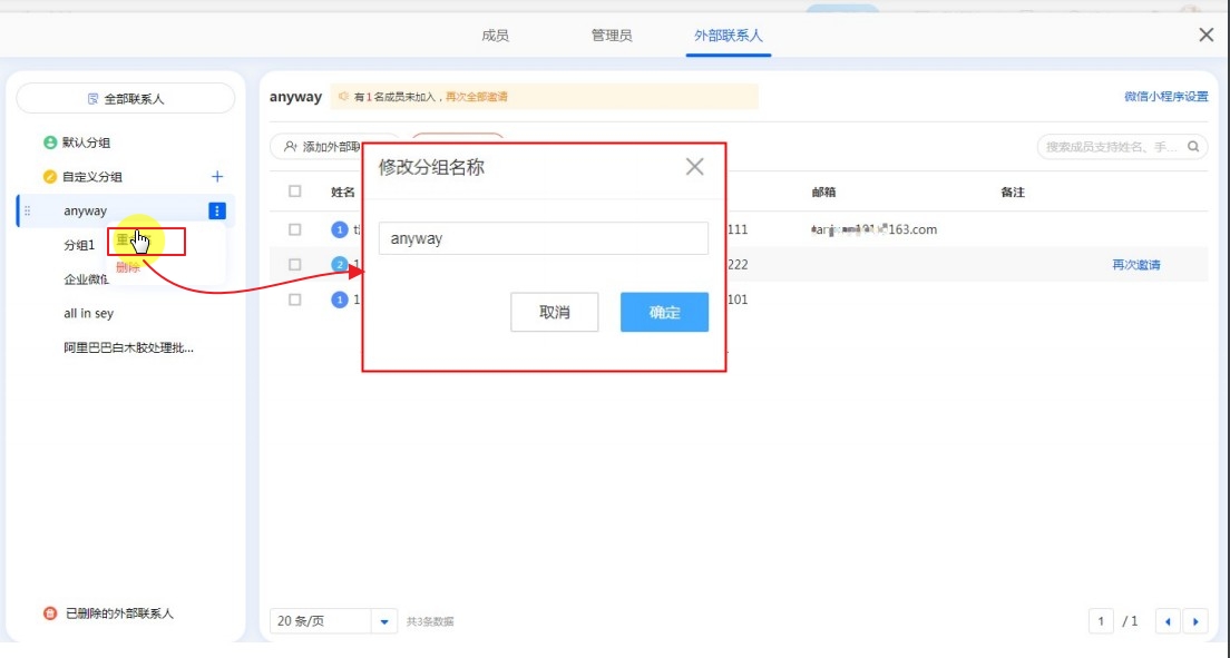 分组类似于内部组织架构中的部门,便于管理外部联系人。