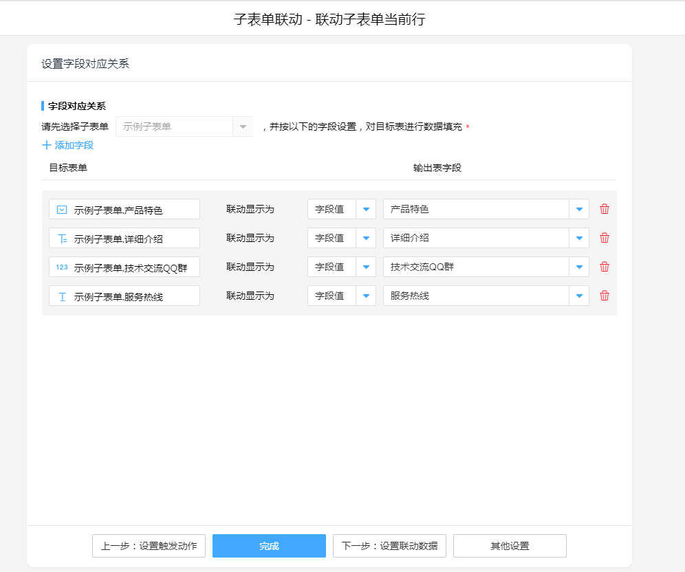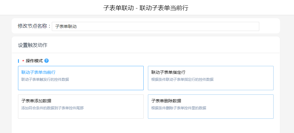 子表单联动,操作模式选择“联动子表单当前行”,设置联动对应关系。