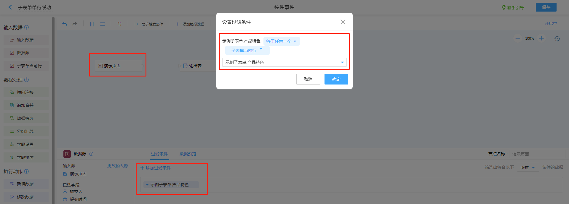 - 设置单行子表单关联条件(既来源数据过滤条件)