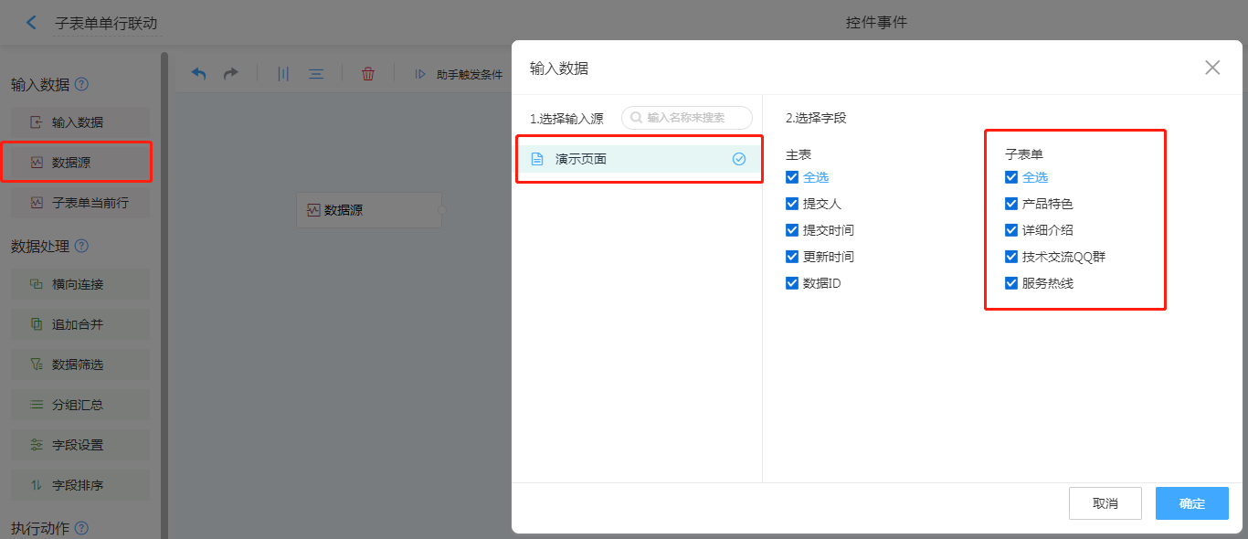 数据源,找到需要关联的表单,选取需要关联的子表单数据