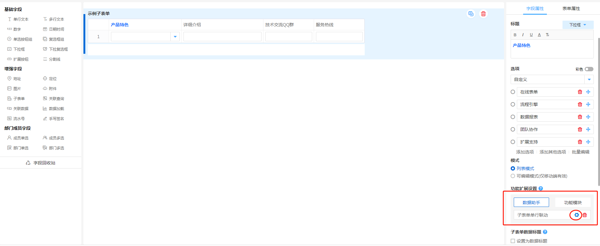 - 进入表单配置页面,找到需要进行触发目标控件(本案例以子表单内下拉框控件为例),点击进入数据助手配置页面