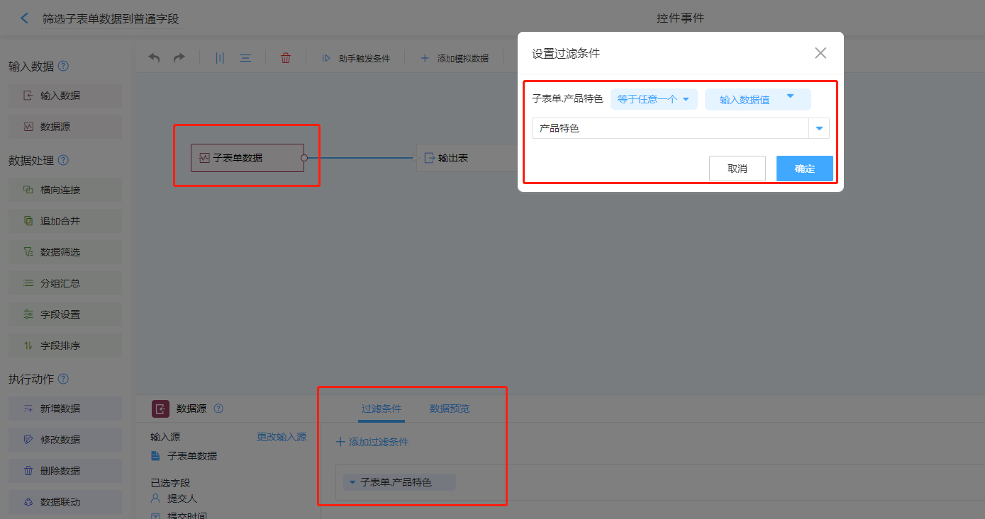 1. 输入数据选择数据源,并选择所需来源子表单中的字段
