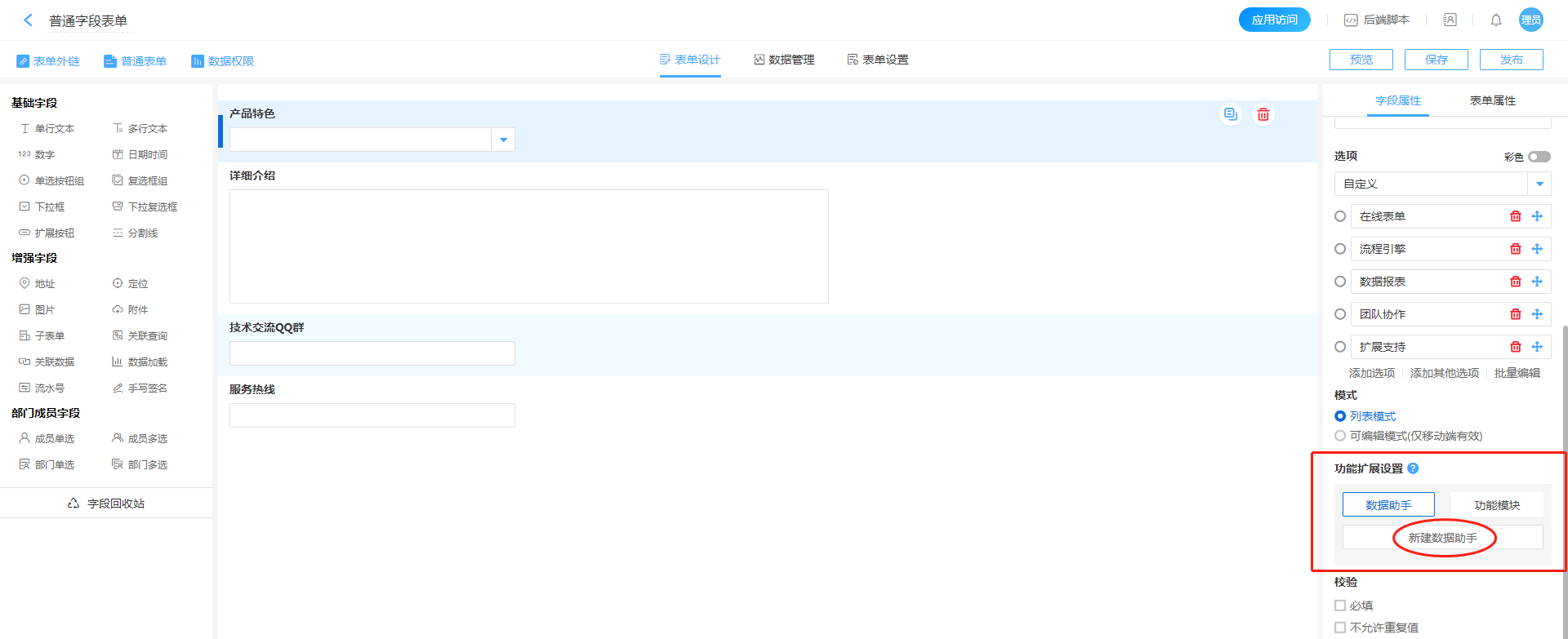 1. 进入表单配置页面,找到需要进行触发目标控件(本案例以单行文本控件焦点触发为例),点击进入数据助手配置页面。
