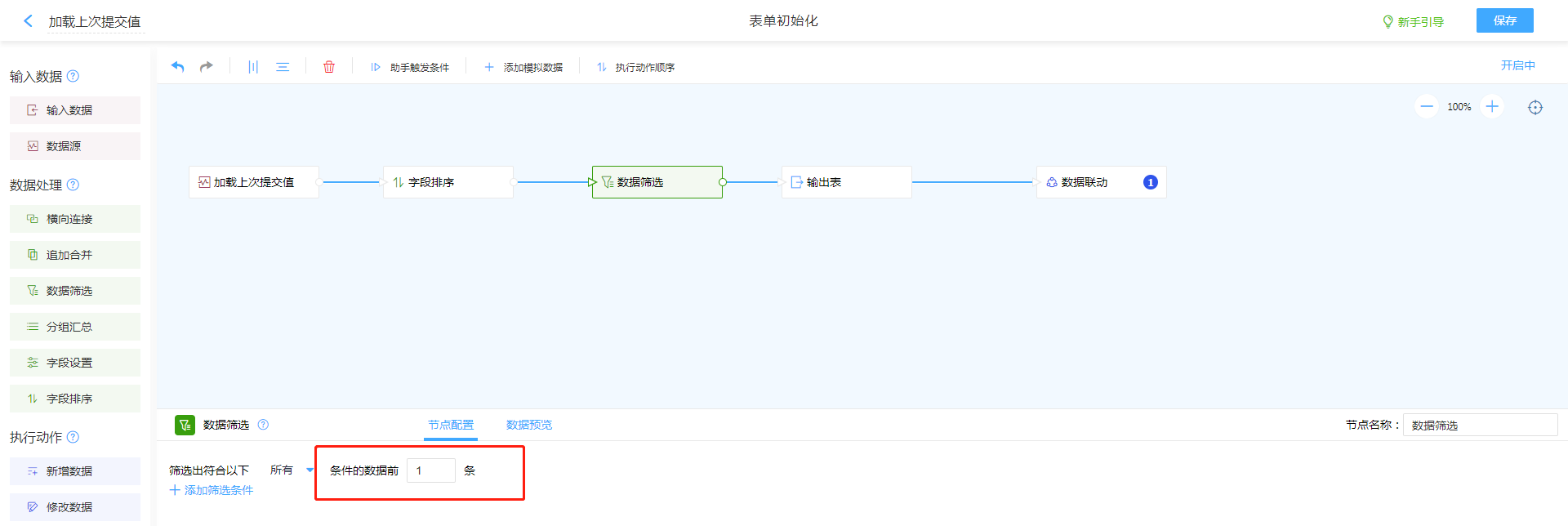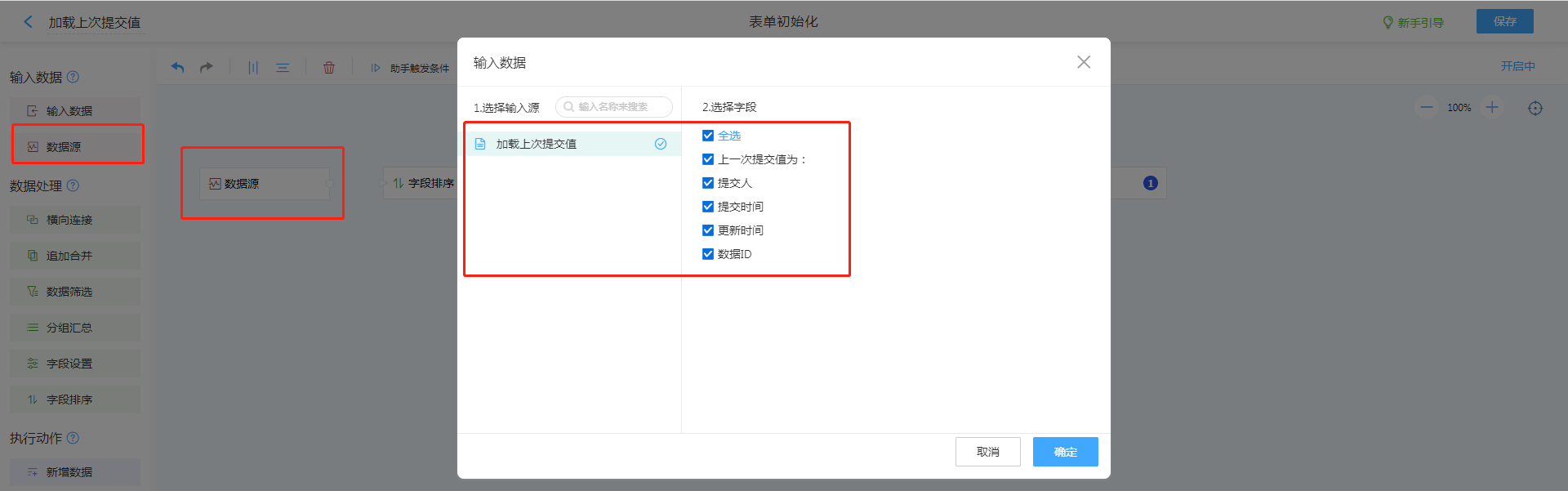 1. 输入数据选择数据源,选择当前表。