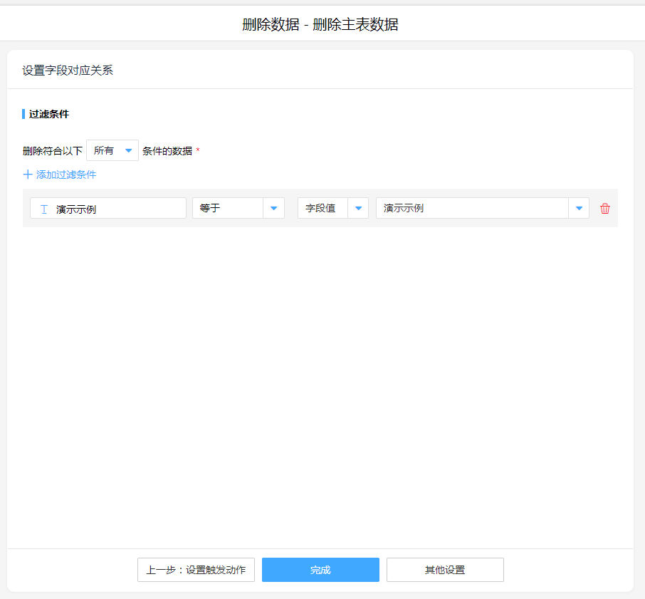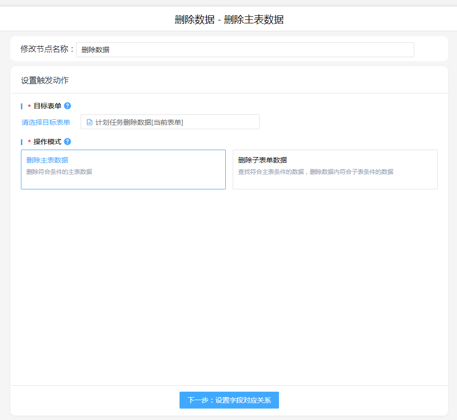 1. 新增执行动作删除,操作模式按照实际情况进行选择,并设置删除条件