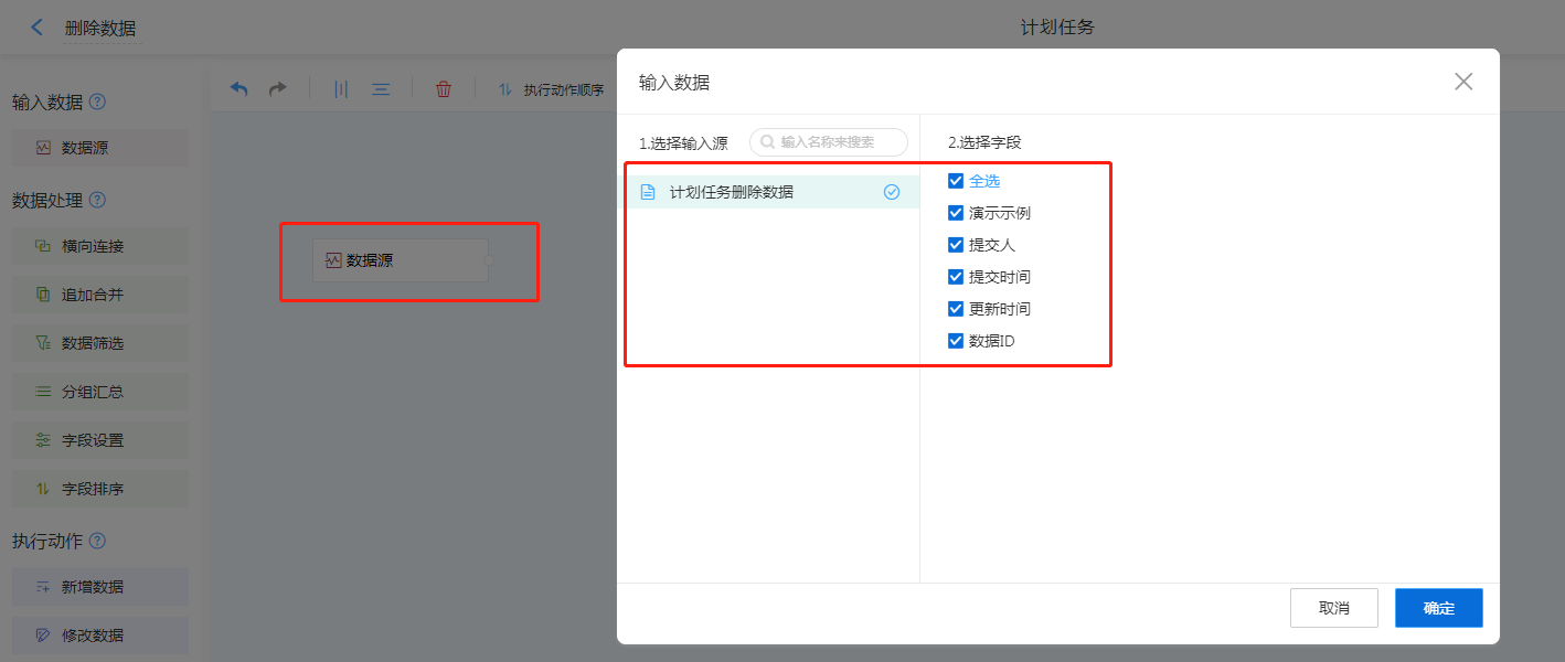 1. 输入数据选择数据源,选择需要进行数据删除的表单
