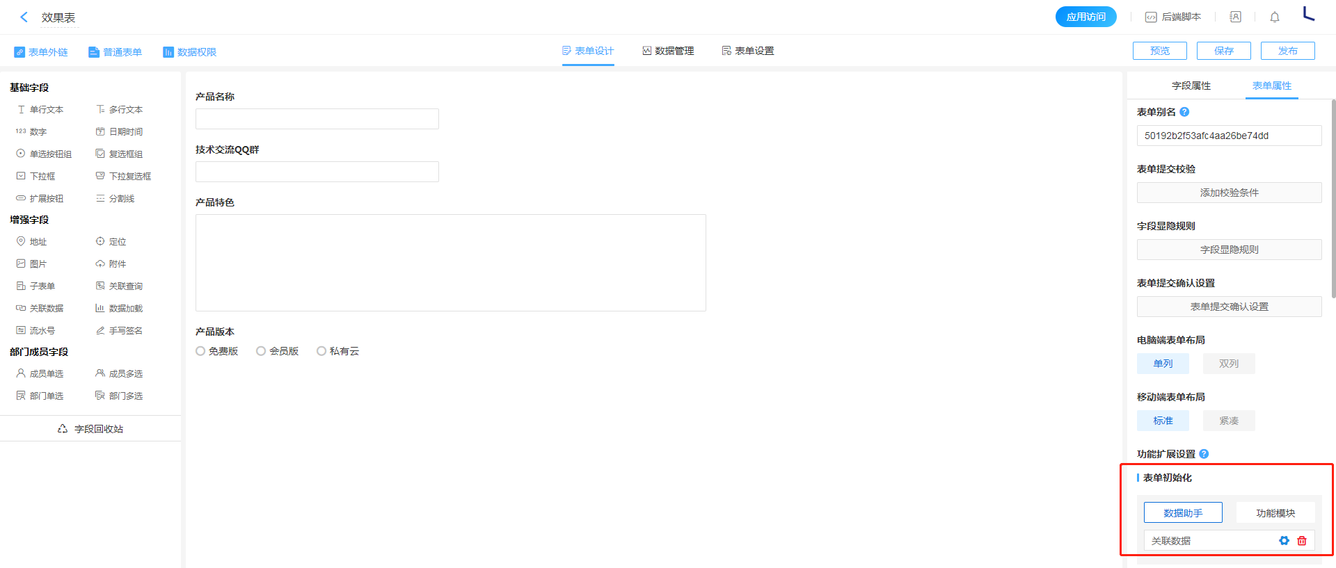 通过对表单初始化或者控件进行数据助手配置,实现表单之间关联数据。