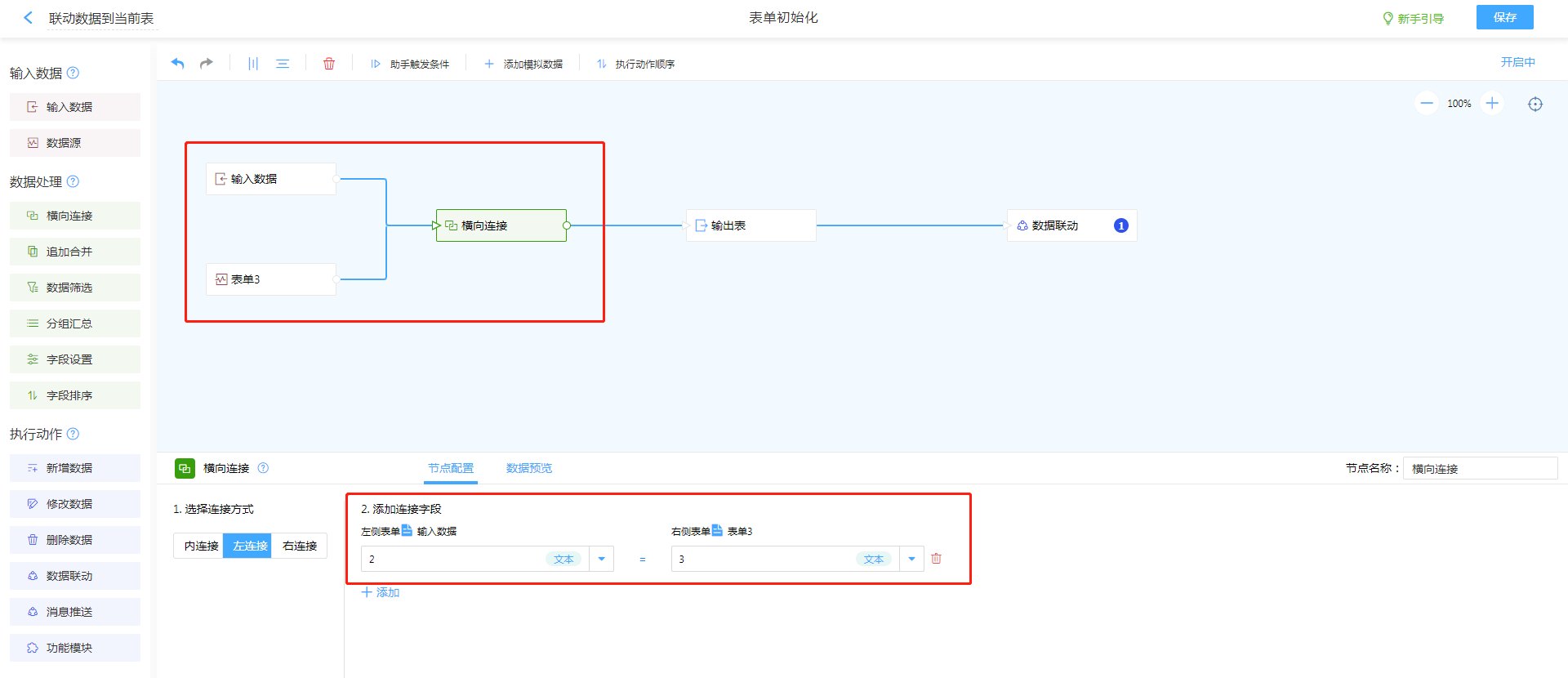 1. 设置横向连接,讲表单2与表单3的关联字段作为连接条件。