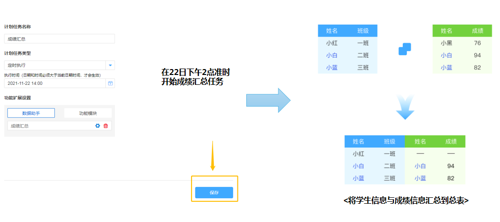 以家校管理中的学生成绩汇总为例,学生每个学期不同类型考试的成绩汇总,需要操作大量的数据表单,在速搭通过计划任务功能配合数据助手,能够有效为老师减负。