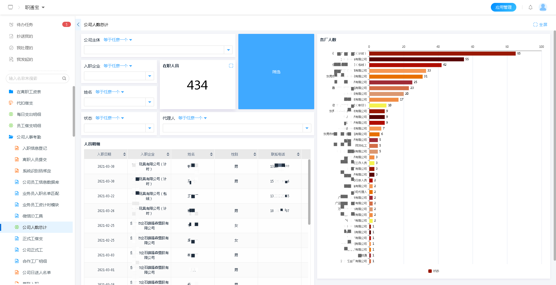 3、利用速搭的报表体系,实时统计所辖企业的在职人员、离职人员、人员入职渠道以及各种与人事相关费用的申报、使用、管理情况。所有款项收支,无论是明细还是汇总分析,借助多样化报表展示一目了然。