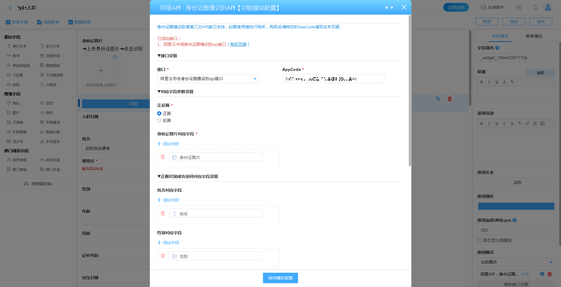 1、利用速搭对接外部API的能力,全自动识别入职员工的身份信息,减少繁琐的个人信息输入步骤,大大提升了人事办事效率。