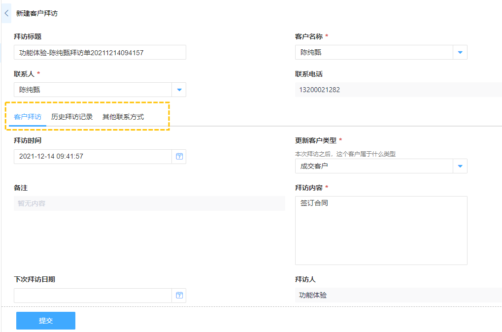 · 客户拜访中,通过多标签页的显示管理客户历史拜访记录、其他联系方式等相关信息,便于客户类型变更及时同步,有助于随时随地掌握客户信息、挖掘潜在客户。
