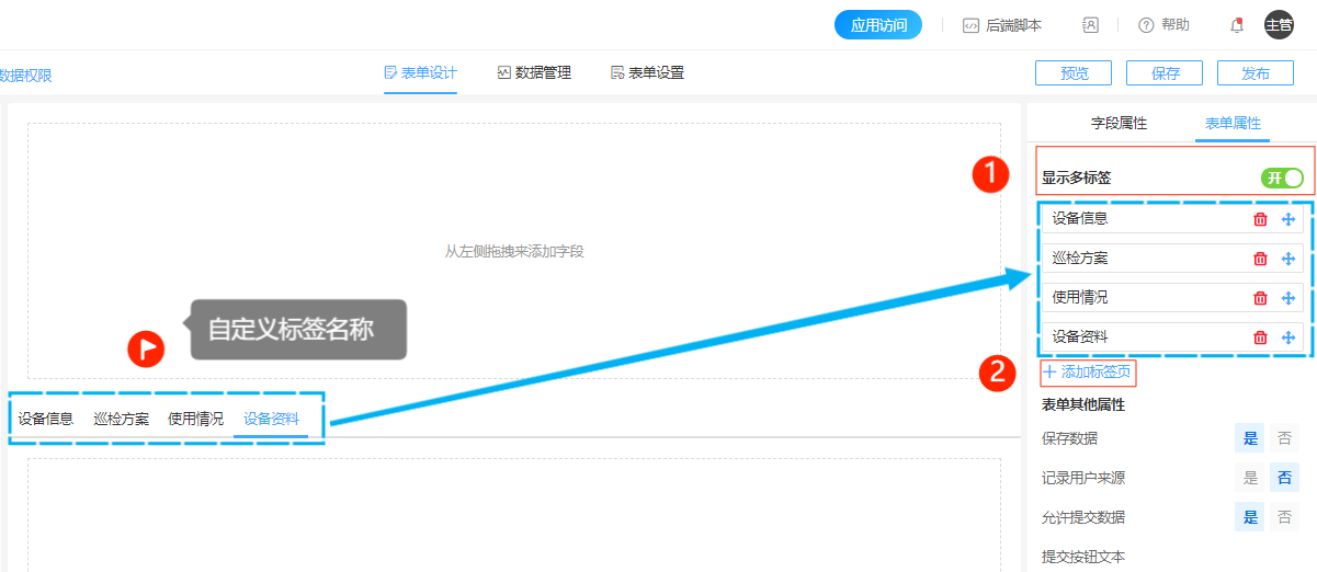 ① 在表单编辑页面>>表单属性>>显示多标签>>开启按钮后,可以对标签进行命名、添加、删除、以及排序。