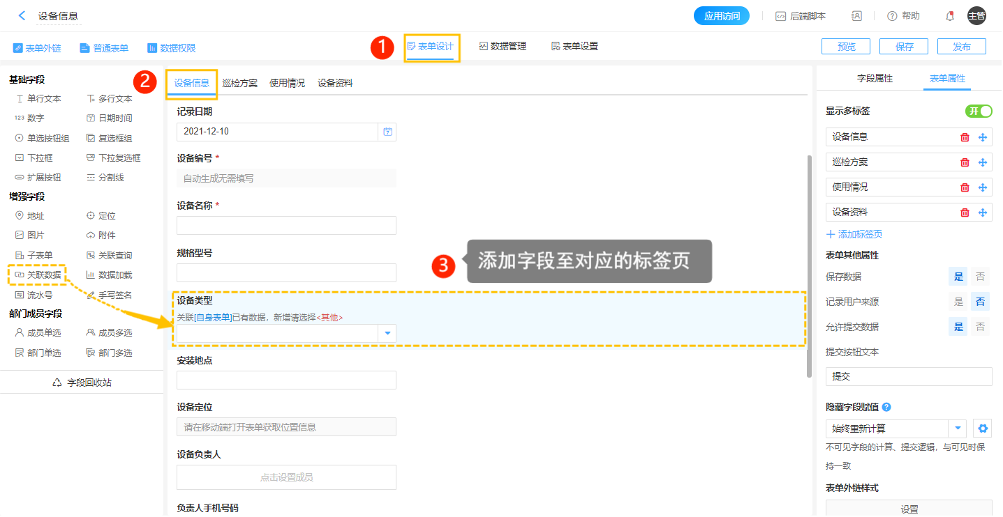 以最常见的设备管理场景举例,通过多标签显示,我们可以在设备信息中添加多个关联表单,分页查看/录入该设备的巡检方案表格、使用情况表格、设备资料等数据表格。