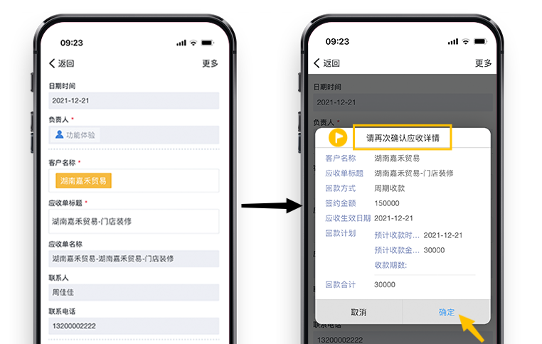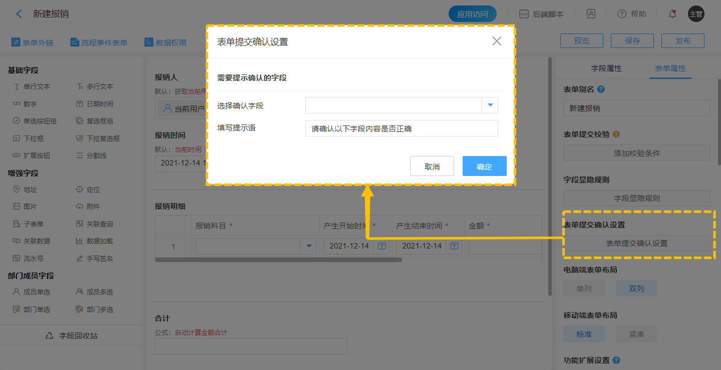 表单可以用于问卷调查、故障报修、自助下单等多种业务场景,但是一般提交人提交后显示的都是同一提示——“提交成功”。但是通过表单提交确认设置,您可以在表单提交前弹出确认对话框进行确认提示,对操作结果而言可以:
