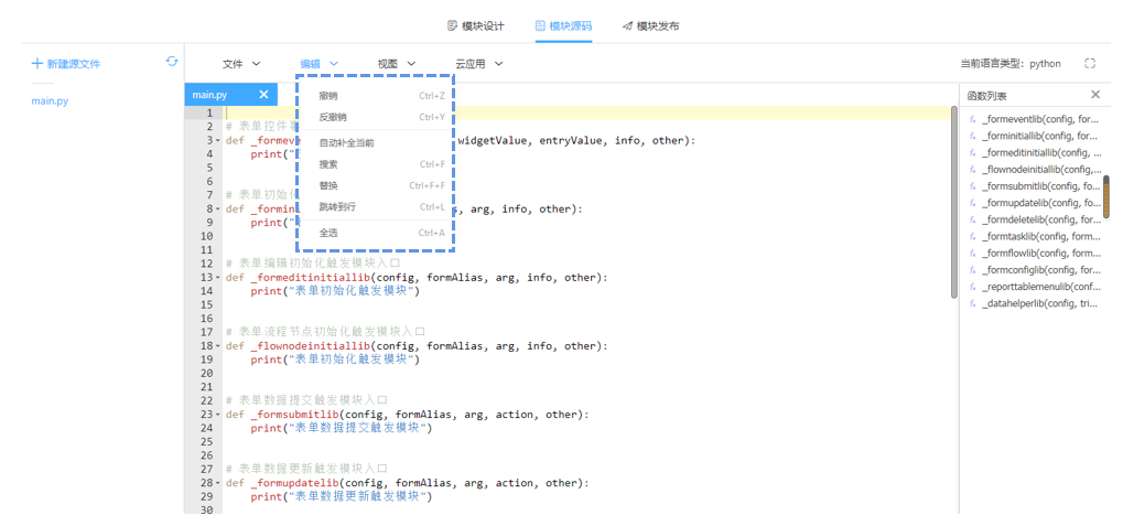 诚然,功能插件通过python封装而来,如果想进一步优化应用速搭也给与了代码在线编辑的权限。选中【插件源码】,编辑菜单中包含了一些常用功能并备注了快捷键,有代码基础的用户可以实现在线调试编辑代码。