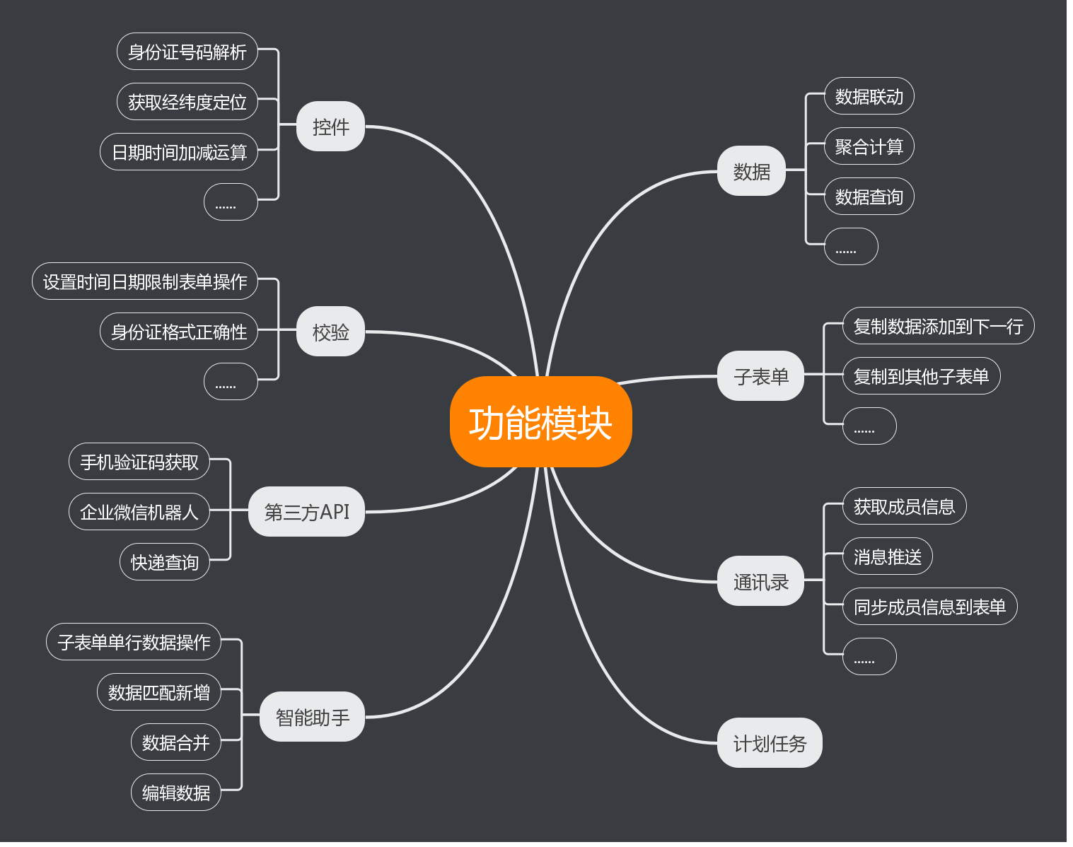 功能插件对于速搭基础功能的辅助升级体现在表单控件能力的扩展、复杂多表的复合计算、第三方对接等多个系统维度,应用场景丰富,能够全方位渗透式的为定制化业务场景服务。