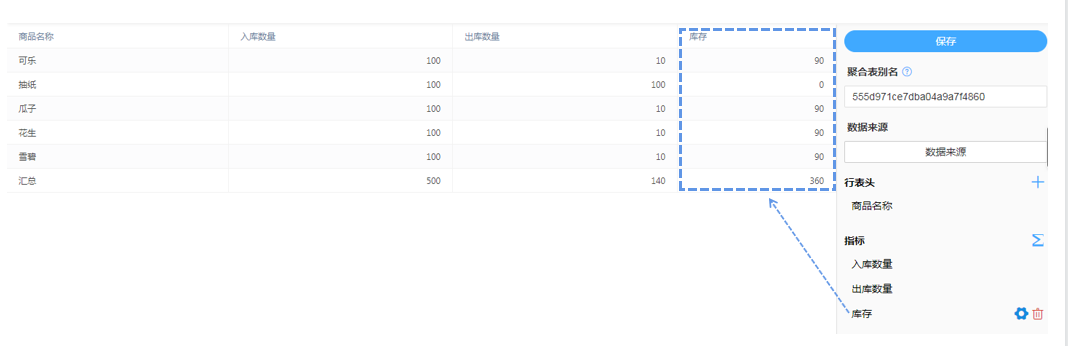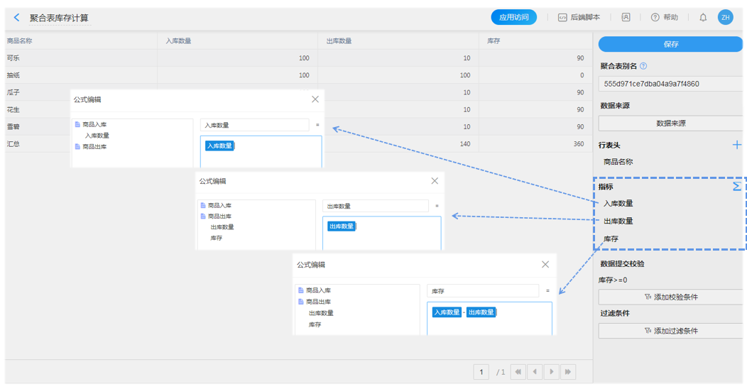 关联关系建立后,接下来进行公式设置。如下所示,我们将聚合表的“指标”设置了入库数量、出库数量以及库存,库存通过【入库数量】-【出库数量】实现。出入库表中的信息变动将同步到聚合表中,进行库存的同步核算。