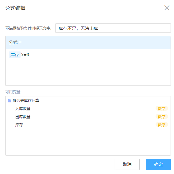 前面我们设置了【库存】=【入库数量】-【出库数量】,在校验条件栏,我们可以设置满足条件必须为【库存】>=0,当不满足条件也就是库存不足的时候,出库予以拦截。