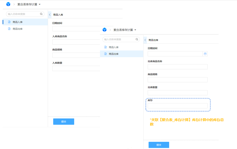 新建进货信息表单与出货信息表单,包括商品名称、商品规格、数量等基本信息,出货表单中的库存总数将借助聚合表功能进行关联计算得出。