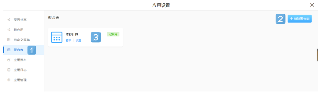 聚合表的计算结果是一张虚拟表数据,可提供给其他表联动调用,入口在“应用开发页面”点击“应用设置”进入到二级页面,选择聚合表——新建聚合表——设置修改名称,然后我们就可以开始聚合表配置了。
