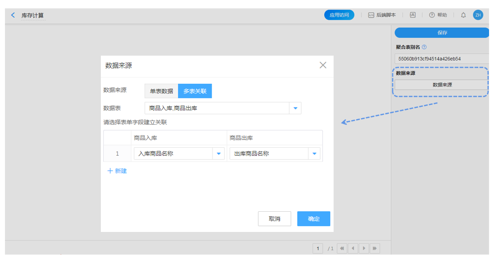 进入编辑页后,在右侧面板选择数据来源,勾选进货表单与出货表单。出入库的商品名称是一致的,我们以此为条件进行表单关联,这样便能实现出入库商品数据的调用。 | -|