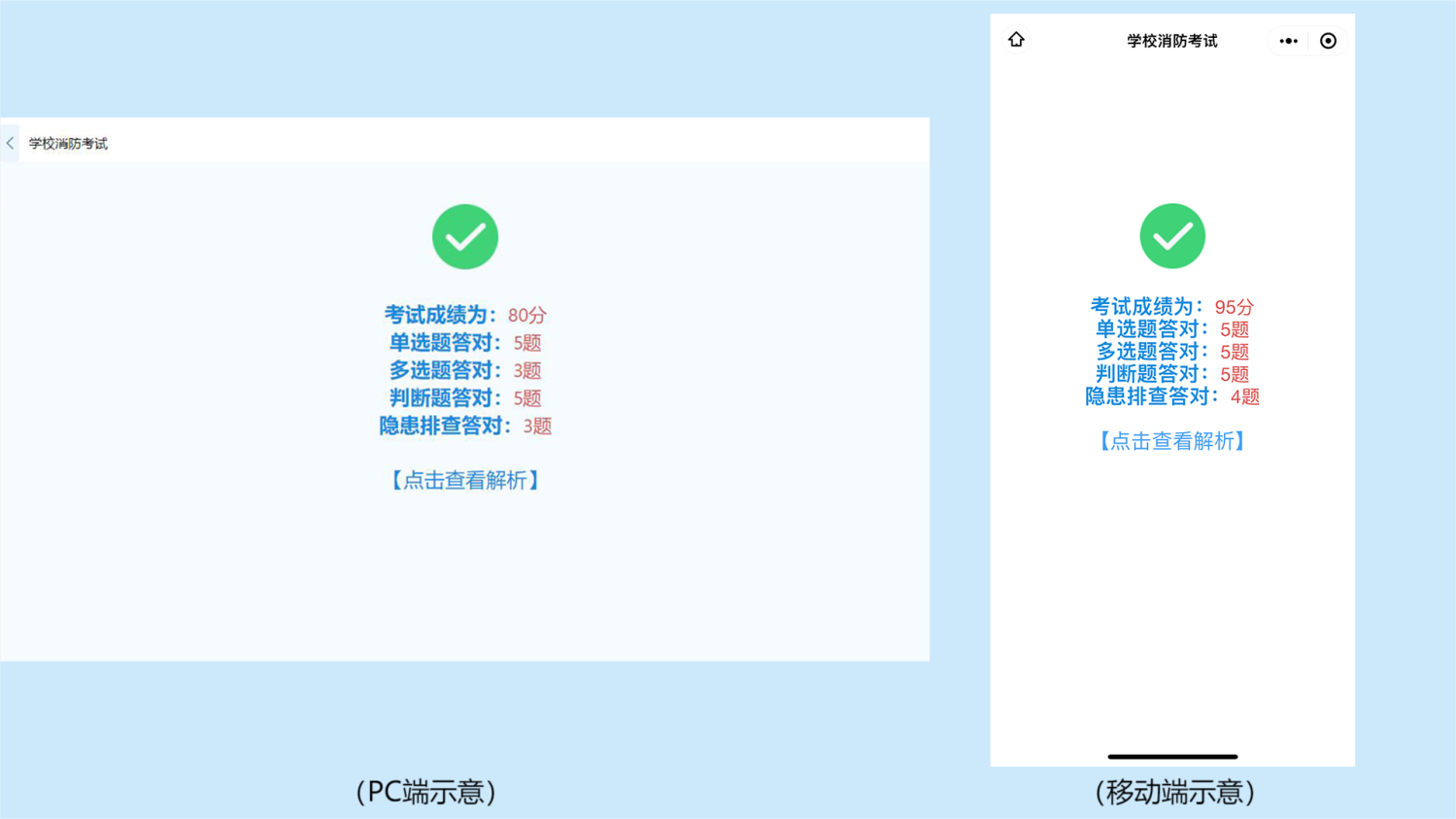 · 在学生参加学校消防考试时,第一时间反馈考试成绩及解析内容,及时了解学生消防知识掌握情况。