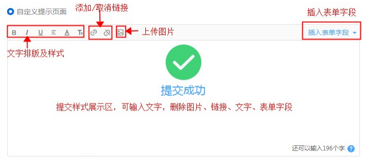 自定义提示页面可以自定义设计提交完成后的提示样式,选择自定义提示页面可以添加文字、表单字段和系统字段、上传自定义图片,还可对文字进行丰富的文本编辑。